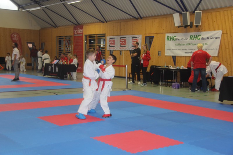 In der Kategorie Schüler unter 12 Jahre, Kata (Kampf gegen einen imaginären Gegner), holte Kempes Poenaru erwartungsgemäß den ersten Platz. Kempes gehört schon zu den „Erfahrenen“. Er hatte bereits im vergangenen Jahr den Gesamt-Ranglisten-Sieg eingefahren. Im Kumite (Kampf mit Gegner) holte er ebenfalls den ersten Platz. In seinem sehr großen Pool kämpften auch seine Vereinskameraden Jamie Frauböse, er holte Platz zwei, und Noah Machauer, welcher sich am Ende den bronzenen Platz erkämpfte. Ganz neu und sehr aufgeregt gingen die beiden Mädchen Stella Vogel und Mira Kühn auf die Matte. Sie lieferten eine sehr gute Leistung, so dass Stella der zwite Platz gelang und Mira auf einen sehr beachtlichen dritten Platz landete. Aleksej Valt verpasste leider durch einen technischen Fehler das Treppchen. Dafür schickte er als ausgewiesener Kumite-Kämpfer hier alle seine Gegner souverän von der Matte und holte die Goldmedaille.