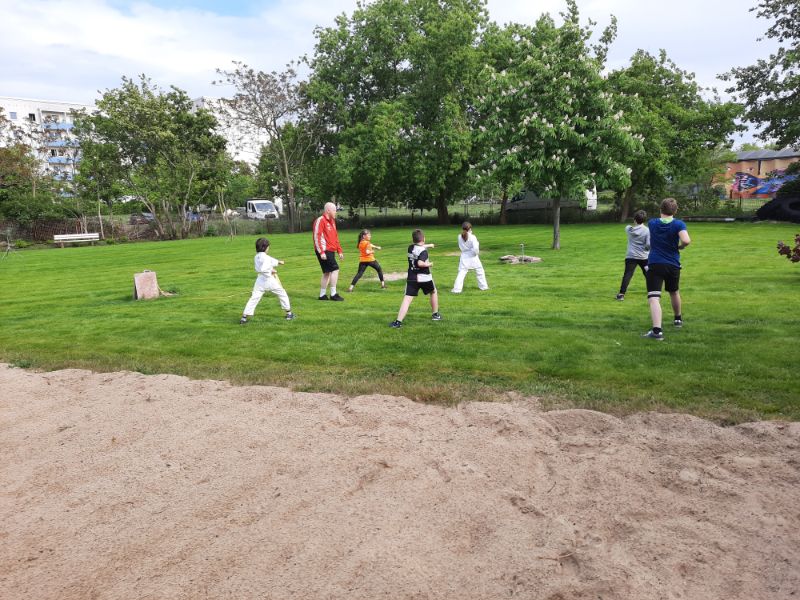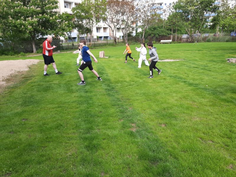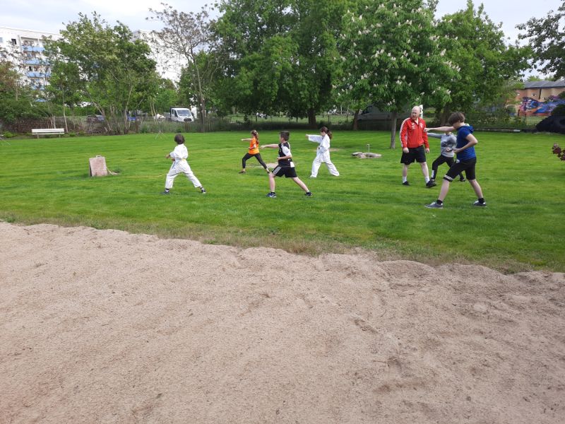 Die Kinder freuten sich auf ihre Trainingseinheiten und waren mit vollem Elan dabei. Vorrangig wird Konditions- und Fitnesstraining, gepaart mit Karate- Techniken, durchgeführt. Kontaktsport ist derzeit noch nicht möglich. Auch die Abteilung der Highlander ist gestartet. Sie hatten zuvor ihre Trainingsfläche hergerichtet.