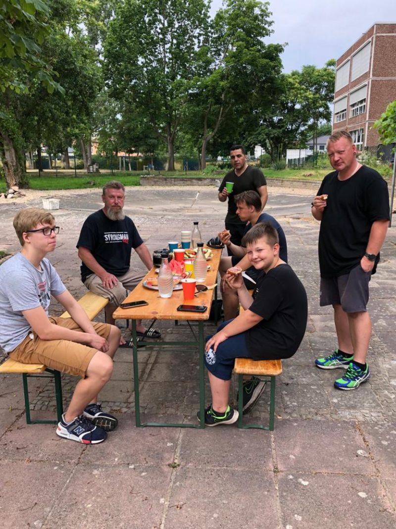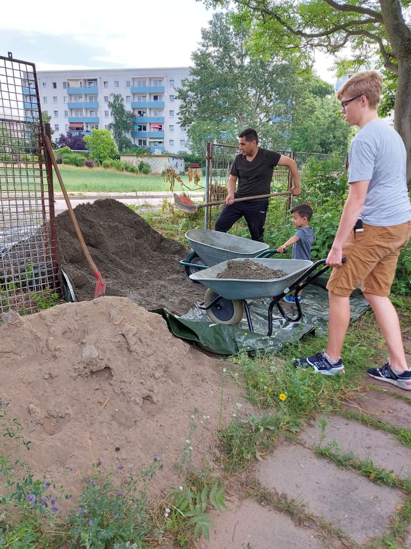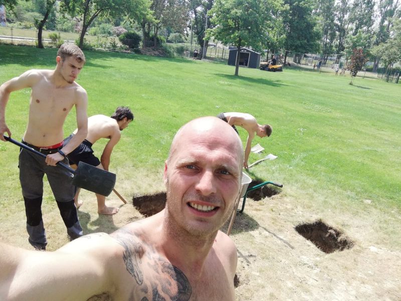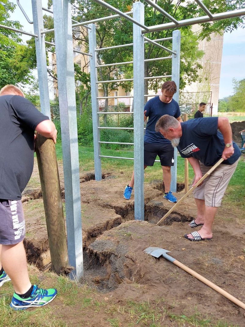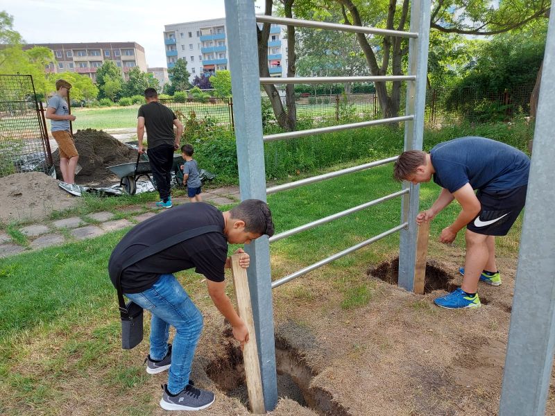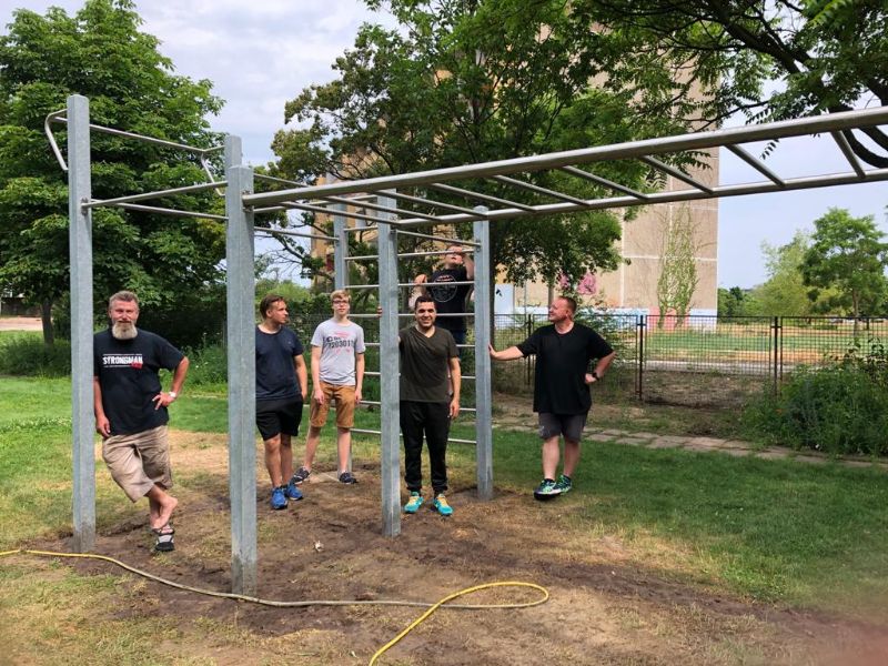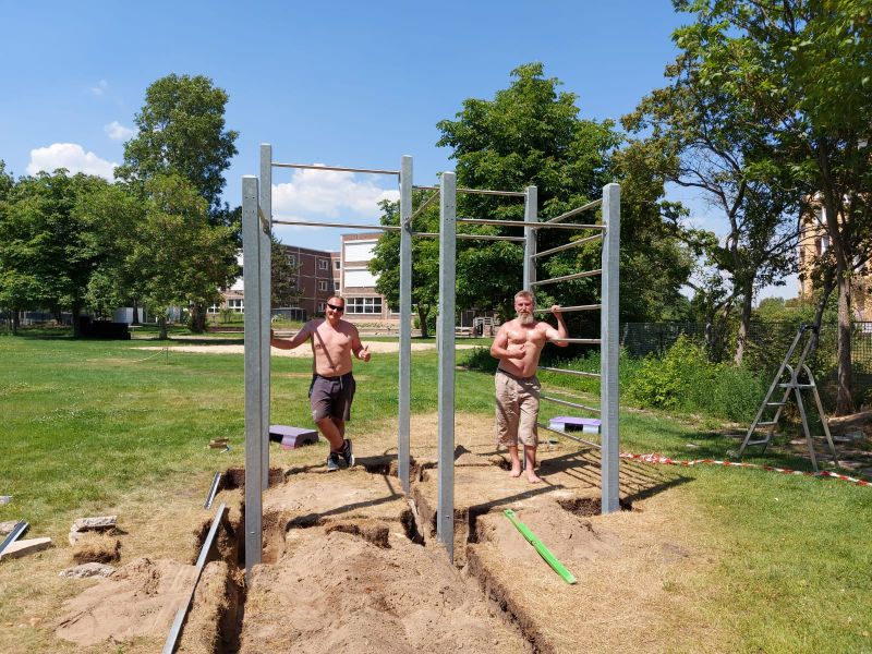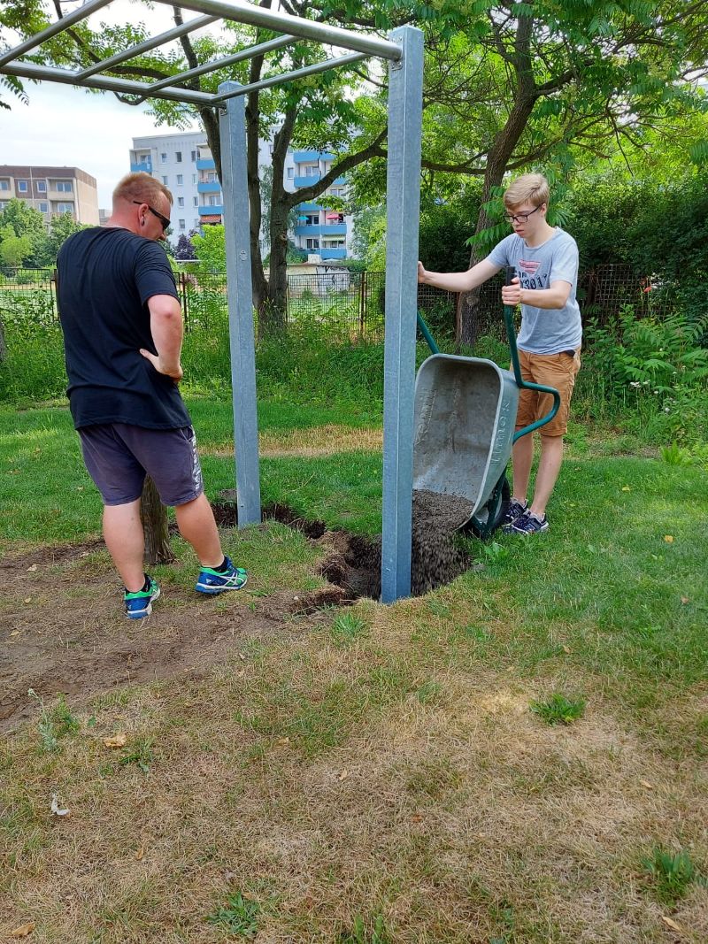 Die Löcher wurden zum Schluß mit Sand aufgefüllt, eine Lage Muttererde aufgetragen und Rasen angesät. Das Gesamtgewicht der aufgebauten Anlage betrug 800 Kg. Nun ist alles fertig und kann genutzt werden.