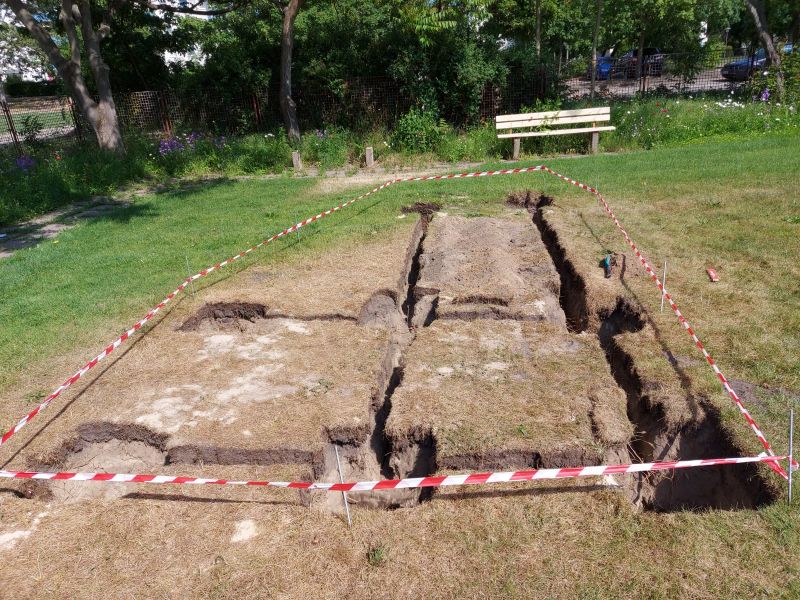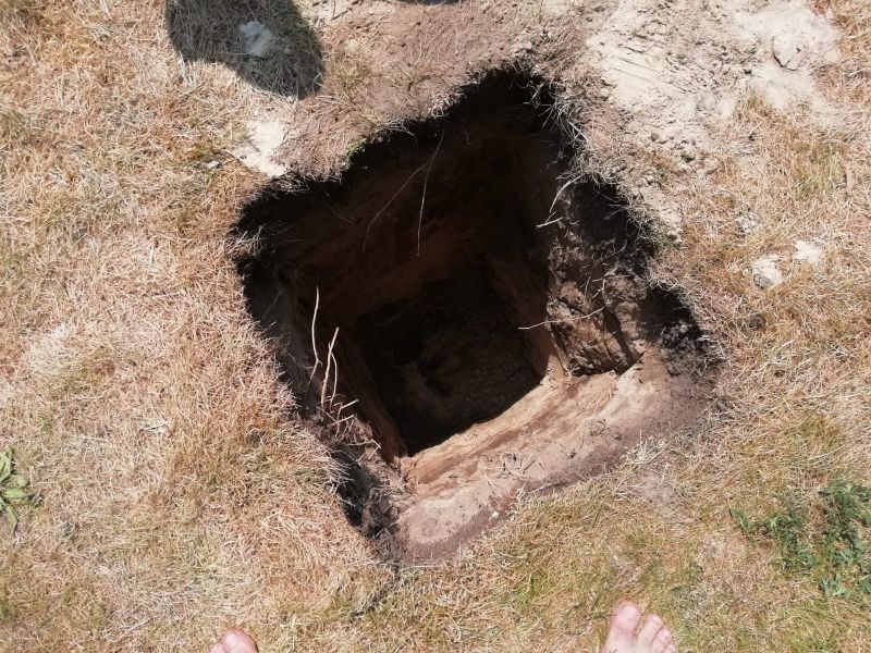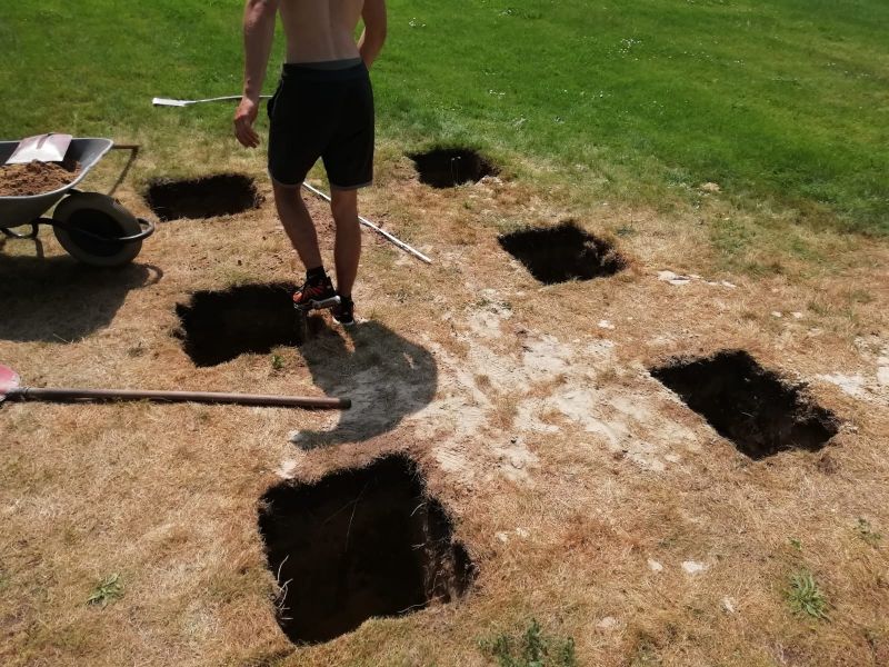 Vor etwa drei Wochen hatten wir mit der Vermessung begonnen. Dem schloss sich dann das Ausschachten der acht Fundamentlöcher von 50 x 50 x 100 an. Danach mussten die Nuten für die Schienen auf 40 cm Tiefe gegraben werden, was am Ende 2 m² Aushub mit sich brachte.
