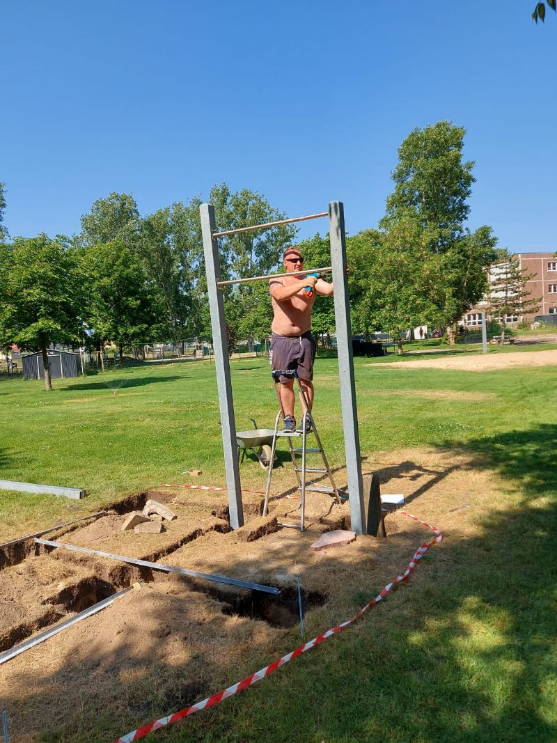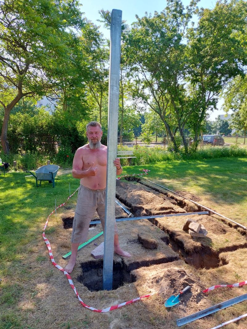 Danach erfolgt dann das Aufstellen und Ausrichten der Pfosten. Als nächste kam das Verbinden und der Einbau der Stangen und Sprossenwände. Als nächstes kam das Fundament dran. Dazu wurden 1 m² Beton verarbeitet.
