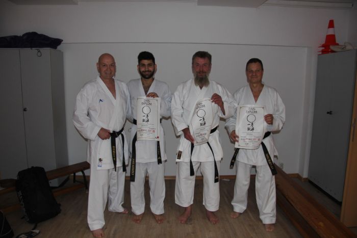 Nach insgesamt vier Stunden waren dann die Prüfungen geschafft. Die Karatekas Amr Hawout, Dirk Bustian und Ingo Lorenz nahmen aus den Händen der Prüfer ihre DAN- Diplome in Empfang. Ihr Trainer Bodo Pippel überreichte ihnen die bestickten schwarzen Gürtel. Auch die angereisten Gäste bestanden mit Bravour ihre Prüfungen.