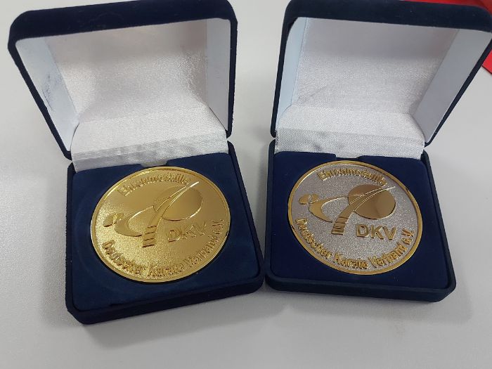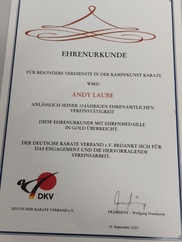 Am vergangenen Sonnabend fand in Bestensee der Karate-Verbandstag Land Brandenburg statt. Die Präsidenten des Landesverbandes, Manja Lenk, nahm die Veranstaltung zum Anlass, um im Namen des Deutschen Karateverbandes verdiente Karateka auszuzeichnen. Dazu gehörten die beiden Brandenburger Ur-Gesteine Bodo Pippel, Vorsitzender des 1. Brandenburger Kampfsportverein und Andy Laube, Vorsitzender des Sho Dan Sha Kai. Bodo erhielt für seine 24-jährige Vereinstätigkeit die Ehrenmedaille in Silber mit Gold überreicht und Andy für 32 Jahre in Gold.