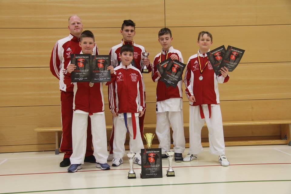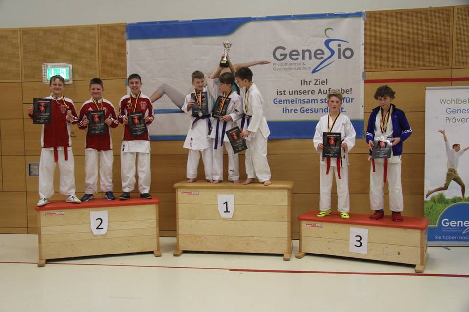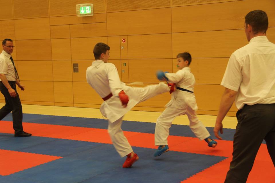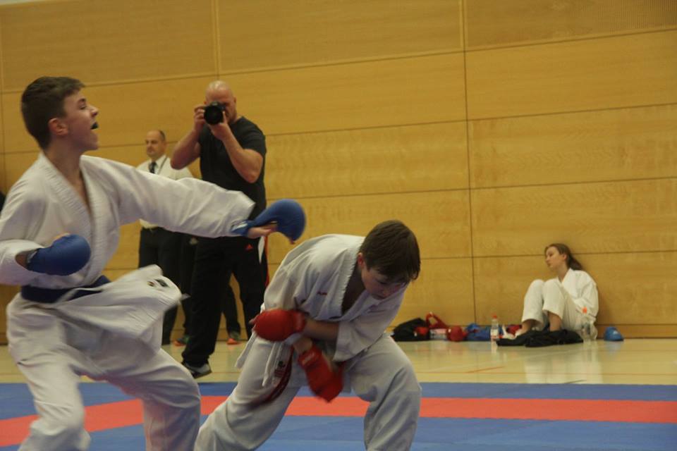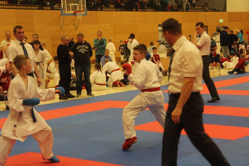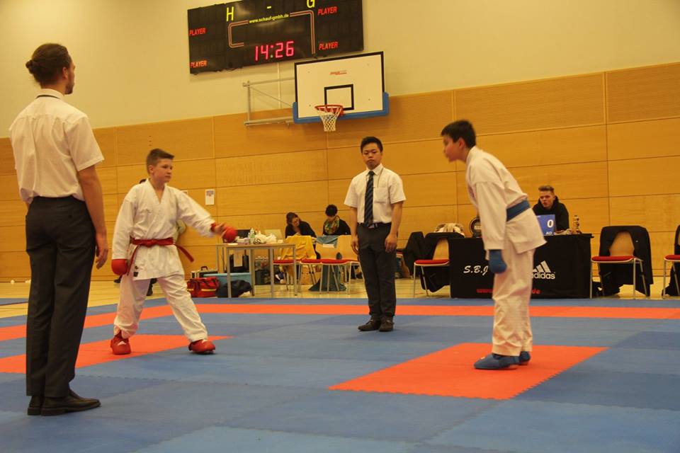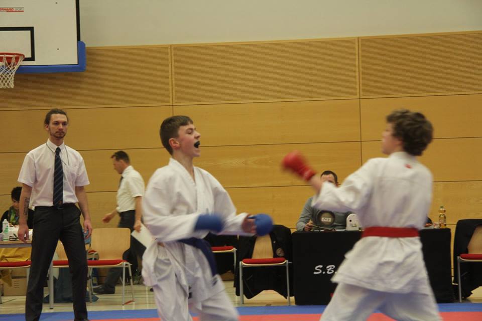 Tom musste sich in der ersten Runde seinem Gegner knapp geschlagen geben. Letztlich konnte er sich aber beim Kampf um Platz drei durchsetzen und die Bronze-Medaille mit nach Hause nehmen. Gerome gelangte in seiner Klasse ins Finale, wo er klar und souverän dominierte. Das brachte ihm den ersten Platz und damit die Goldmedaille ein. Zu guter Letzt ging es in den Mannschaftskampf Kumite. Hier wurde das Team um Gerome und Tom durch den Sportfreund Richard Feike aus Senftenberg ergänzt. Sie konnten sich gemeinsam in das Finale kämpfen wo sie dann unterlagen und die Silbermedaille errangen.